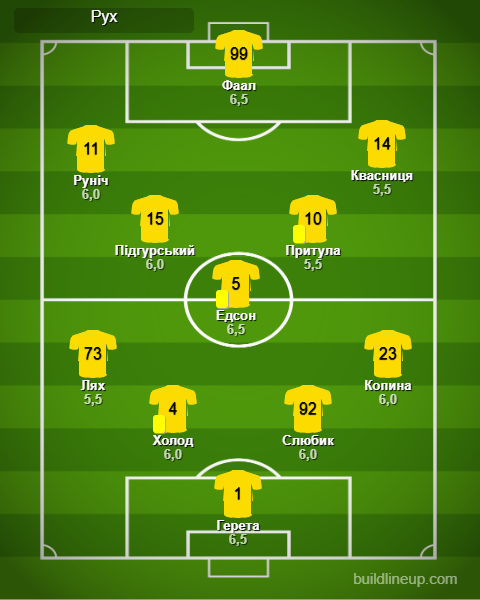 «Рух»: Герета – Лях, Холод, Слюбик, Копина – Едсон Фернандо – Руніч (Алмазбеков, 76), Підгурський (Слюсар, 59), Притула (Сапуга, 59), Квасниця (Клайвер, 59) – Фаал