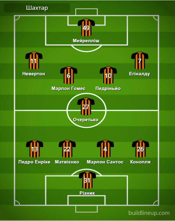 «Шахтар»: Різник – Педро Енріке, Матвієнко, Марлон Сантос (Бондар, 85), Конопля – Очеретько – Невертон (Лукас, 85), Марлон Гомес (Бондаренко, 76) , Педріньйо, Егіналду (Ізакі, 70) – Мейрелліш (Кауан Еліас, 70).