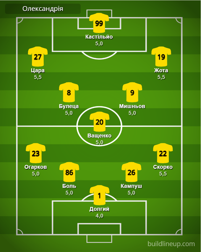 «Олександрія»: Долгий – Огарков, Боль, Кампуш, Скорко – Булеца (Кулаков, 66), Ващенко (Фернандо, 66), Мишньов – Цара (Козак, 72), Кастільйо (Хуссейн, 66), Жота (Амарал, 87).
