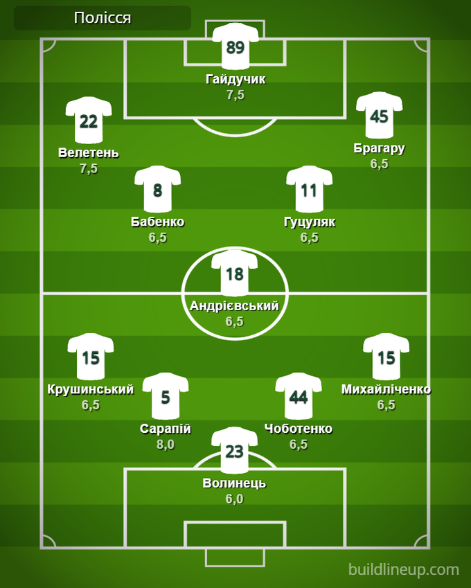 «Полісся»: Волинець – Крушинський, Сарапій, Чоботенко, Михайліченко – Бабенко (Лєднєв, 88), Андрієвський (Таллес, 71) – Велетень (Назаренко, 71), Брагару (Шепелєв, 59), Гуцуляк – Гайдучик (Філіппов, 59).