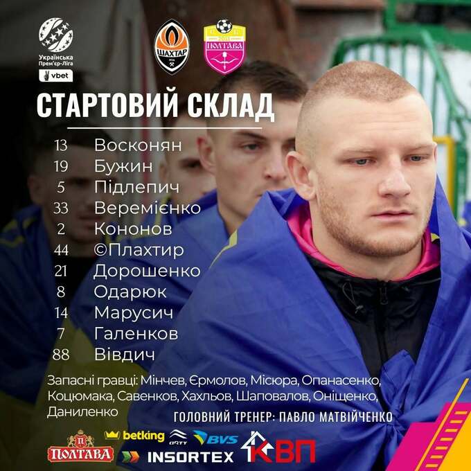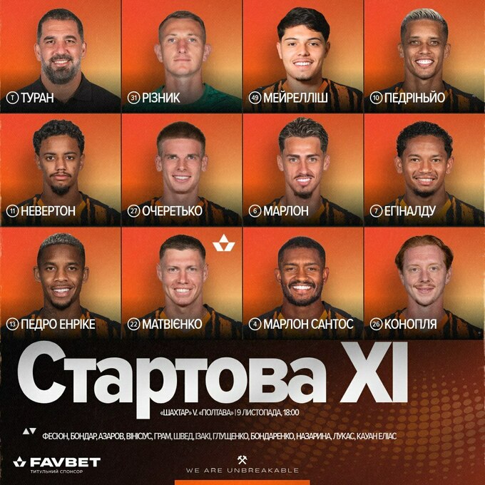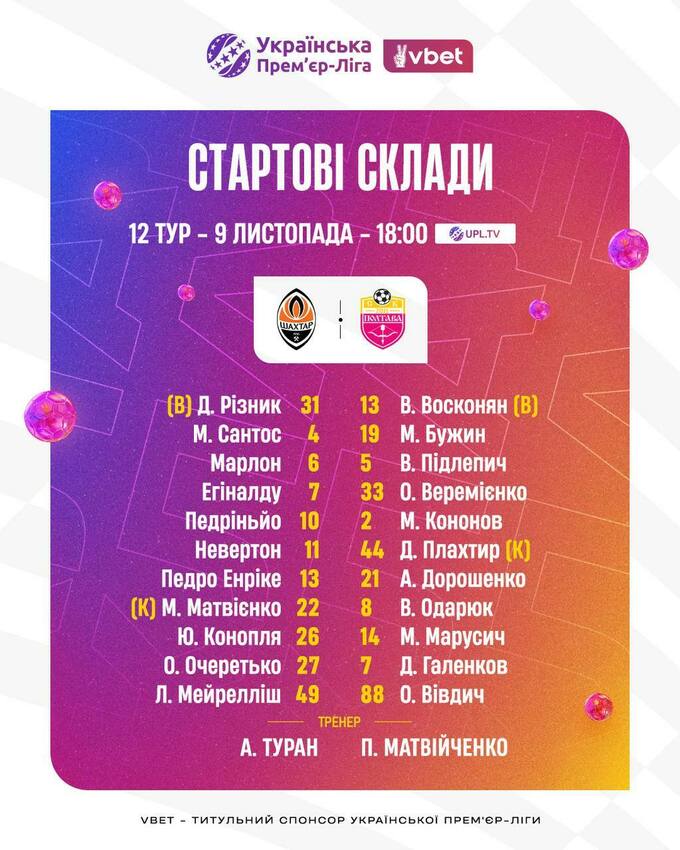 Головні тренери команд Шахтар та Полтава – Арда Туран та Павло Матвійченко – обрали стартові XI своїх підопічних на очне протистояння у матчі 12-го туру УПЛ 2025/26.