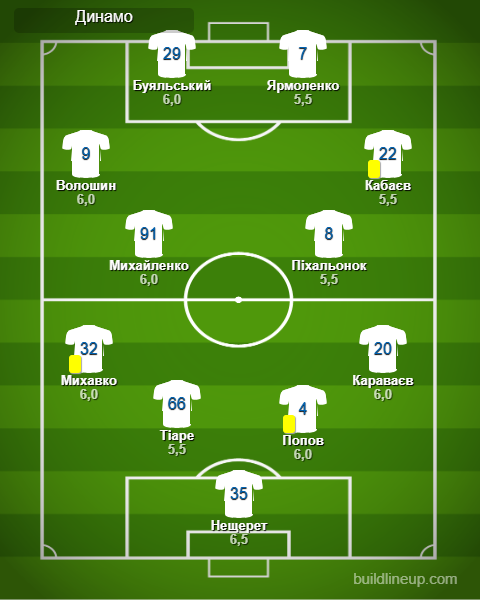 «Динамо»: Нещерет – Михавко, Попов, Тіаре (Дубінчак, 46), Караваєв – Волошин (Огундана, 65), Михайленко, Піхальонок (Шапаренко, 65), Кабаєв – Буяльський (Бленуце, 81), Ярмоленко (Герреро, 34)