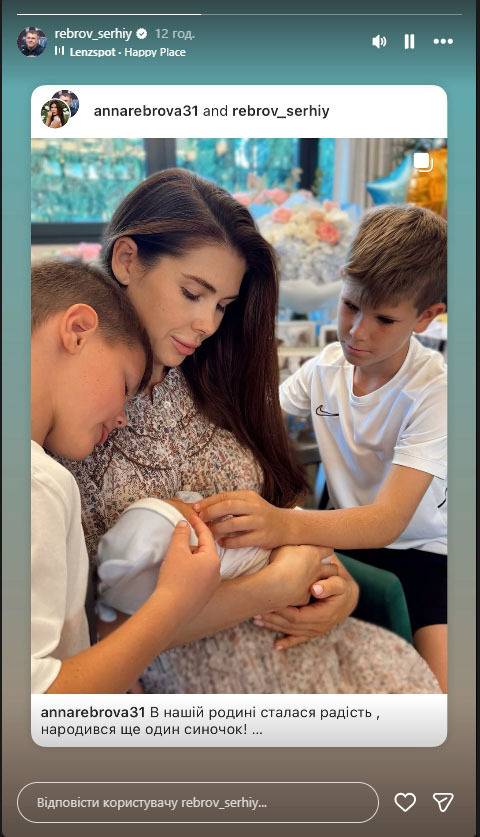 Сергій Ребров не додав жодного слова – просто поділився публікацією дружини, супроводивши її піснею Lenzspot – Happy Place. Символічний вибір треку ідеально передає атмосферу тепла, ніжності та сімейного щастя.