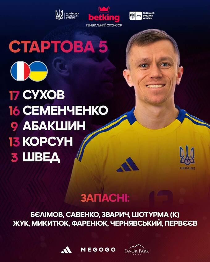 Ворота України захищатиме Олександр Сухов, на поле вийдуть такі гравці: Ростислав Семенченко, Данило Абакшин, Ігор Корсун, Назар Швед.