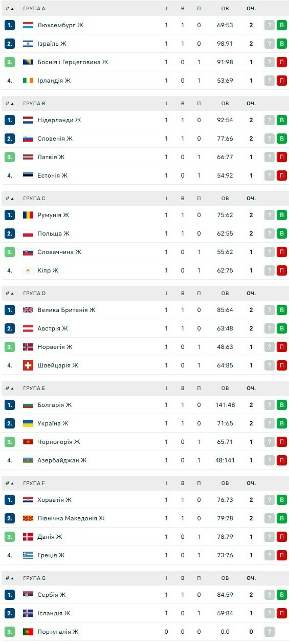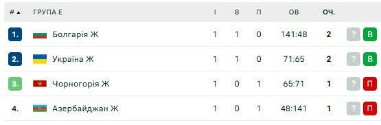 Збірна України посідає друге місце, маючи 1 перемогу, як і Болгарія. А от Чорногорія та Азербайджан стартували з поразок.