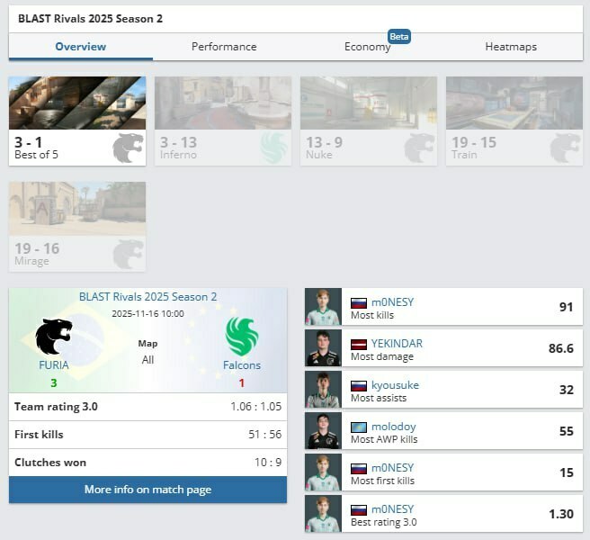 Команда FURIA продовжила свою домінуючу серію над Falcons, обігравши їх уже вчетверте поспіль – після матчів на IEM Cologne, FPG 2 та IEM Chengdu. Цього разу бразильці здобули перемогу 3:1 у гранд-фіналі BLAST Rivals Season 2, який став одним із найвидовищніших у 2025 році.