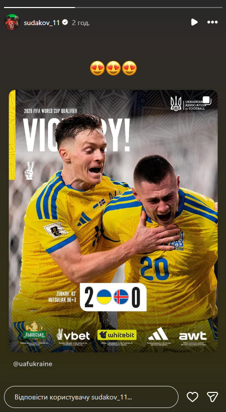 Також після завершення зустрічі Судаков опублікував Instagram-stories з результатом гри.