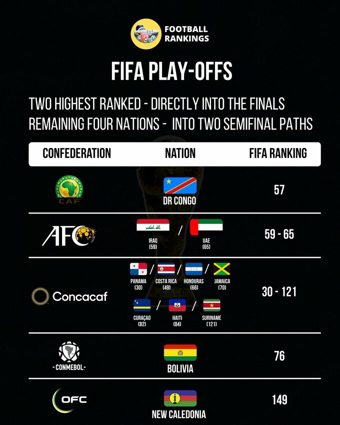 У міжконтинентальному плей-офф у березні 2026 року зіграють 6 збірних: Болівія, Нова Каледонія, ДР Конго, команда з Азії (ОАЕ або Ірак), а також два представники КОНКАКАФ. Вони розіграють дві путівки на ЧС-2026.