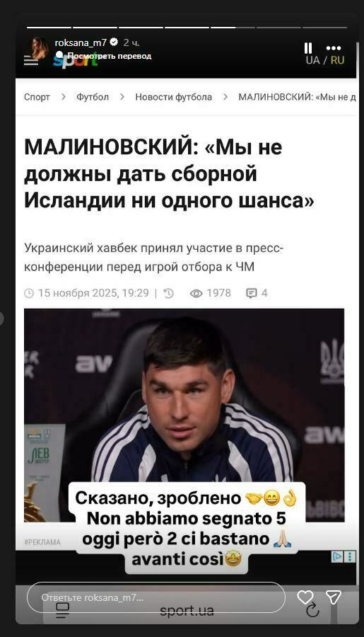 Національна збірна здобула «суху» перемогу над Ісландією, забезпечивши собі плей-оф відбору до чемпіонату світу. Після гри лаконічно висловилась дружина Руслана Маліновського, Роксана, яка пригадала слова футболіста перед матчем: «Сказано – зроблено», – написала дівчина. Цікаво, що Роксана додала у stories саме скріншот публікації на Sport.ua.