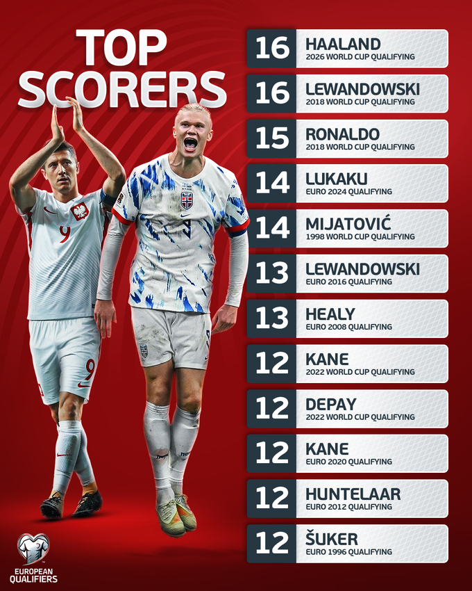 16 забитих м'ячів – це найвищий показників за голами в європейській кваліфікації за одну кампанію.