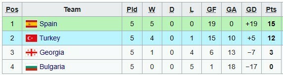 Іспанія має на три очки більше Туреччини (15 очок проти 12) та значну перевагу за різницею м'ячів (+19 проти +5).
