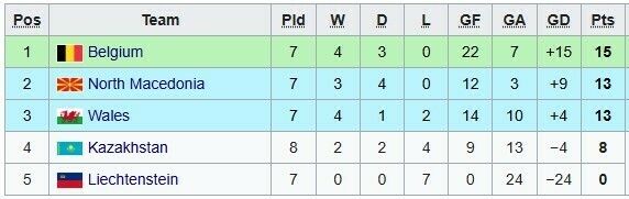 - Бельгія (15 очок), Північна Македонія, Уельс (по 13), Казахстан (8), Ліхтенштейн (0)