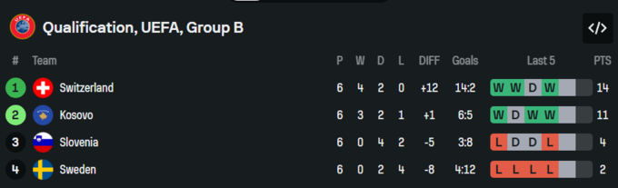Швейцарія з 14 очками посіла перше місце і отримала пряму путівку на ЧС. Косово з другої позиції вирушить у плей-оф кваліфікації, як і Швеція, яка хоч і стала останньою, але завдяки успіхам у Лізі націй випробує свої сили в матчах на виліт.