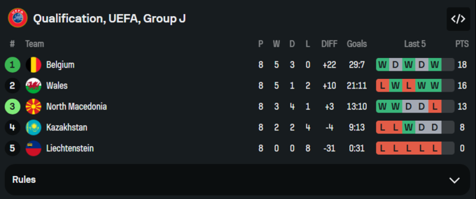 Бельгія з 18 очками виграла групу і отримала пряму путівку на чемпіонат світу.