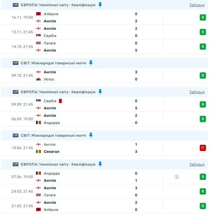 | 1 | Англія | 8 | 8 | 0 | 0 | 22 - 0 | 16.11.25 Албанія 0:2 Англія13.11.25 Англія 2:0 Сербія14.10.25 Латвія 0:5 Англія09.09.25 Сербія 0:5 Англія06.09.25 Англія 2:0 Андорра | 24 | |