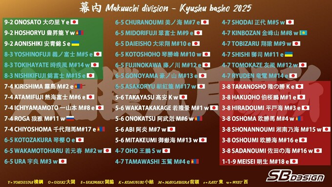 Завтра, 20 листопада, Аонішікі/Явгусишин боротиметься з маеґашірою №4 Деґі Ошомою (справжнє ім’я – Перевсурен Делґербаяр) з Монголії (3 – 8). Оносато зустрінеться з Коносуке Ого, Хосьорю – з комусубі Акірою Такаясу (5 – 6).