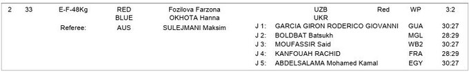 У ваговій категорії до 48 кг Анна Охота зазнала поразки у протистоянні з Фарзоною Фозіловою, яка представляє Узбекистан. Українка протрималася п'ять раундів, проте поступилася одноголосним рішенням суддів.