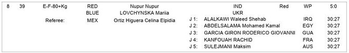 У категорії понад 80 кг збірну України представляла Марія Ловчинська, яка дала конкурентний бій Нупур Нупур з Індії. За підсумками напруженого протистояння індійська учасниця вирвала перемогу з рахунком 3:2.