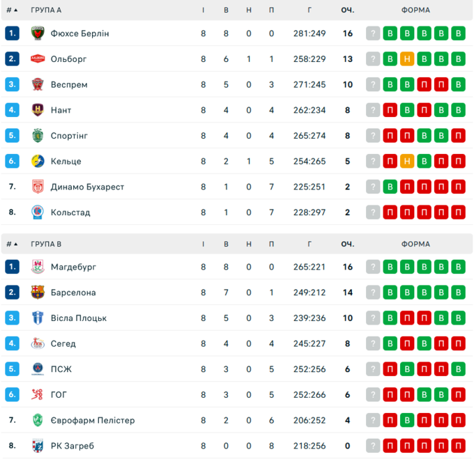 У гандбольній Лізі чемпіонів відбулися поєдинки восьмого туру. Лідерами у своїх групах залишаються Фюхсе Берлін та Магдебург.