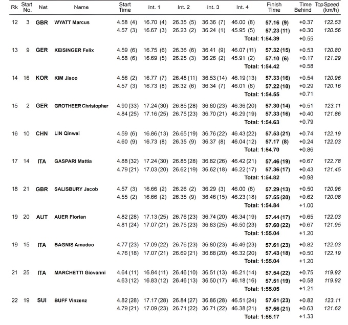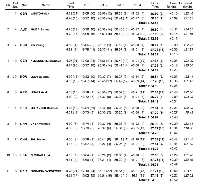 З перемоги розпочав сезон учасник з Великобританії Метт Вестон, який виграв минулого сезону загальний залік КС. За ним розташувався австрієць Самуель Майєр з відставання в 0.15 секунди, третій – китаєць Чжен Їнь, який втратив першу позиції після другого спуску.