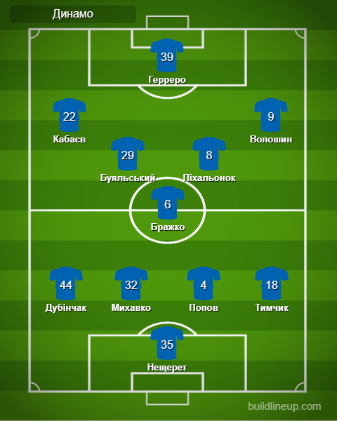 «Динамо»: Нещерет – Дубінчак, Михавко, Попов, Тимчик (Караваєв, 68) – Бражко – Буяльський, Піхальонок – Кабаєв, Герреро (Пономаренко, 79), Волошин (Шола, 68).