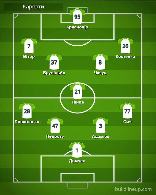 «Карпати»: Домчак – Полегенько (Мірошніченко, 63), Педрозу, Адамюк, Сич – Бруніньйо, Танда, Чачуа – Вітор (Фабі, 81), Краснопір (Ігор, 81), Костенко (Шах, 63).