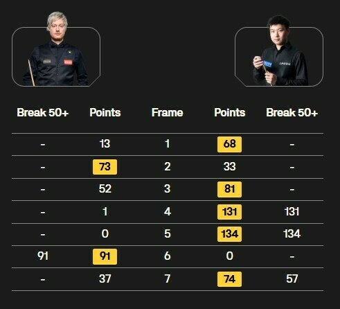 Зробивши швидку серію у 131 очко, свій другий сенчурі на турнірі, Чжао збільшив перевагу (3:1). Він продовжив атакувати після перерви, зробивши брейк 134 і збільшивши перевагу до трьох фреймів, а залишалося зіграти чотири (4:1).