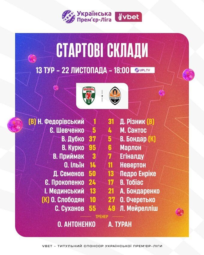 Головні тренери «Оболоні» та донецького «Шахтаря» – Олександр Антоненко та Арда Туран – визначилися зі стартовими складами на матч 13-го туру УПЛ.