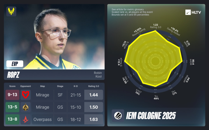 Перегляд статистики допоміг і Робіну «ropz» Кулю, якого раніше не включили в EVP на IEM Cologne через скромні показники у групі (0.77 фрага за виграний раунд). Але на рейтингу 3.0 його результат у півфіналі проти MOUZ виріс до 1.34 — цього достатньо, щоб додати естонцеві статус EVP. Це вже сьоме EVP ropz у сезоні, перевищивши власний рекорд 2019 року (5).
