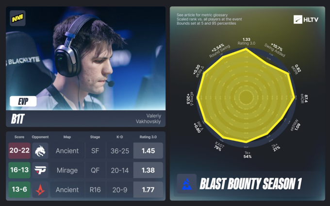 Першим у переліку став Валерій «b1t» Ваховський, який отримав додатковий EVP за виступ на Bounty Season 1 ще у січні. Тоді він поступився Міхаю «iM» Івану за рейтингом 2.1, але після перерахунку випередив конкурента на LAN (1.16). За новою системою навіть без урахування матчу проти Imperial Valkyries він показав рівень EVP: рейтинг 1.21, +1.49% Swing і 119.7 ADR у раундах-перемогах. Це вже третій EVP b1t у сезоні після IEM Katowice та IEM Cologne.