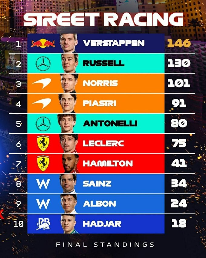 Формула‑1 опублікувала традиційний залік чемпіонату етапів, які проходять на вуличних автодромах. Лас‑Вегас став останнім у списку, і за підсумками його проведення Макс Ферстаппен став чемпіоном неофіційного заліку Ф1 із 145 очками.