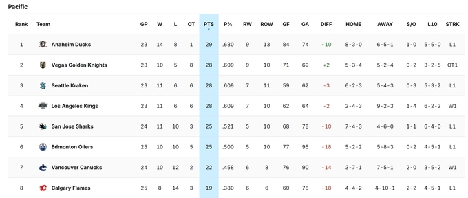 У цьому дивізіоні несподівано лідирує Анахайм. Очікувалося, що Качки продовжують перебудову, але молоді форварди Лео Карлссон, Каттер Готьє і Беккет Сеннекке утримують команду в топі.