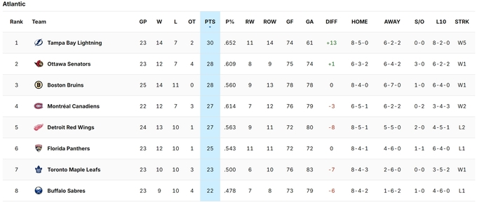 В Атлантичному дивізіоні лідирує Тампа-Бей, яка виграла 8 з 10 останніх матчів. У топ-4 входять Оттава, Бостон і Монреаль.