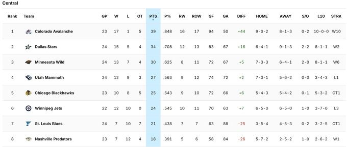 На Заході найкращою командою конференції та Ліги є Колорадо. Лавини перебувають на серії з 10 поспіль перемог і за 23 матчі в основний час програли лише один раз.
