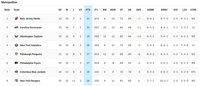 У Столичному дивізіоні триває боротьба Нью-Джерсі і Кароліни за лідерство, а у топ-4 знаходяться Вашингтон і Нью-Йорк Айлендерс.