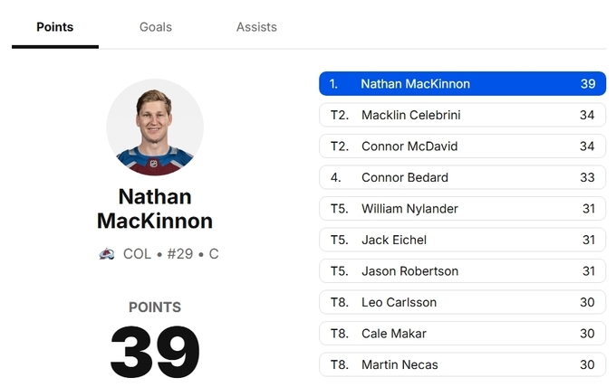 У гонці бомбардирів логічно лідирує найкращий гравець найкращої команди чемпіонату. Форвард Колорадо Натан Маккіннон набрав 39 очок і випереджає Коннора Макдевіда і Маккліна Селебріні, у яких по 34 бали.
