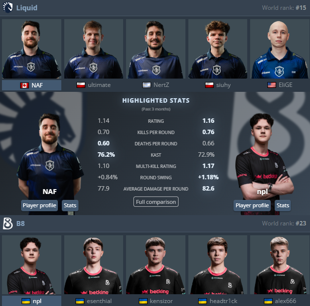 B8 зараз посідають 23-те місце світового рейтингу HLTV, тоді як їхній суперник Liquid розташований значно нижче – на 15-й позиції.