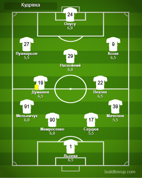 «Кудрівка»: Льопка – Мельничук, Мамросенко, Сердюк, Мачелюк – Думанюк (Сторчоус, 63), Векляк (Матвєєв, 84) – Пушкарьов (Рогозинський, 46), Нагнойний, Козак (Світюха, 75) – Овусу (Лєгостаєв, 75)