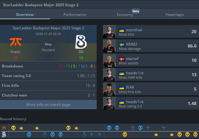 Утім, після цього fnatic узяв лише один раунд, тоді як B8 поступово перехопили контроль над Ancient і довели справу до перемоги. Кінцевий рахунок – 13:11 на користь B8, які продовжують свій шлях на турнірі з чудовим результатом 2-0 і знаходяться за крок від основного третього етапу.