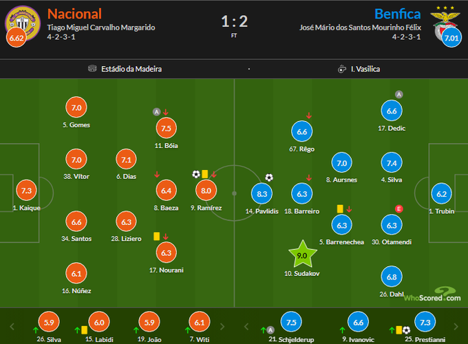 Оцінки WhoScored за матч Насьонал – Бенфіка (1:2)