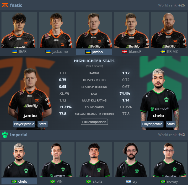 fnatic зараз посідають 26-те місце світового рейтингу HLTV, тоді як їхній суперник Imperial розташований на 42-й позиції.