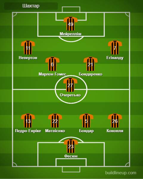 «Шахтар»: Фесюн – Педро Енріке, Матвієнко, Бондар, Конопля (Тобіас, 80) – Марлон Гомес, Очеретько (Криськів, 63), Бондаренко (Ізакі, 63) – Невертон, Мейрелліш (Кауан Еліас, 63), Егіналду.