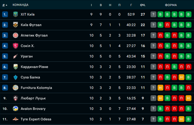 Після 11 турів київський «ХІТ» з відривом у п'ять очок від другого рядка, на якому розташувався «Kyiv Futsal», лідирує у таблиці.
