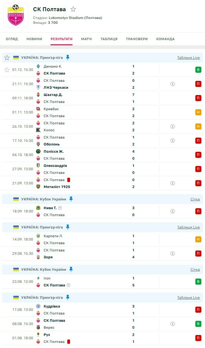 | 16 | Полтава | 14 | 2 | 3 | 9 | 13 - 33 | 08.12.25 15:30 Полтава - Епіцентр01.12.25 Динамо Київ 1:2 Полтава21.11.25 Полтава 0:2 ЛНЗ09.11.25 Шахтар Донецьк 7:1 Полтава01.11.25 Кривбас 2:2 Полтава26.10.25 Полтава 2:2 Колос Ковалівка | 9 |
