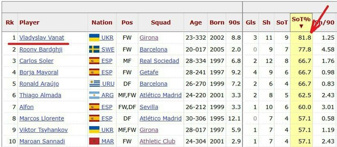 А поки втрачає та нервує. Тому має 3 забитих за 3.3 xG – у топ-25% найгірших футболістів чемпіонату за різницею між фактичними та очікуваними голами. Єдина радість: майже завжди влучає у площину. Зробив це у 82% випадків, коли бив. І, не повірите, це одноосібно найкращий показник у чемпіонаті Іспанії серед п’яти сотень футболістів. Залишилося навчитися не влучати у воротаря…