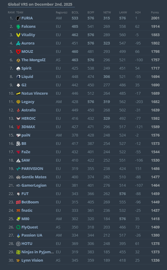 Valve також опублікувала оновлену таблицю глобального рейтингу VRS станом на 1 грудня, де показані місця команд і їхні результати в кожному з п’яти ключових факторів системи: