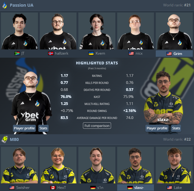 Passion UA зараз займають 21-ту позицію у світовому рейтингу HLTV, тоді як M80 розташовані поряд – на 22-му місці. Команди опинилися у кошику 2-2, а це означає, що цей матч буде одночасно і за вихід у третій етап, і за виживання в турнірі – переможець проходить далі, а той, хто програє, припиняє виступи на мейджорі.