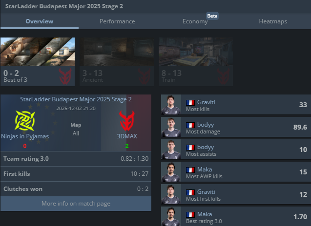 3DMAX стали останньою командою, яка пробилася до третього етапу Budapest Major, впевнено обігравши Ninjas in Pyjamas з українцем Артемом «r1nkle» Морозом у складі, з рахунком 2:0 у вирішальному матчі кошика 2-2.