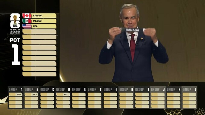 19:50. На сцену для жеребкування вийшли: Прем'єр-міністр Канади Марк Карні, Президент Мексики Клаудія Шейнбаум, Президент США Дональд Трамп