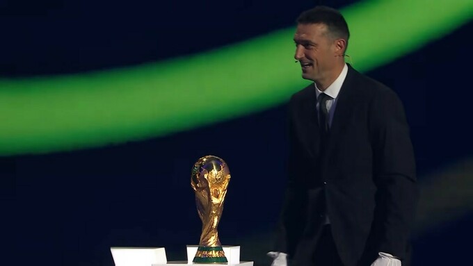 19:41. Коуч аргентинської збірної Ліонель Скалоні виносить на арену трофей – Кубок світу
